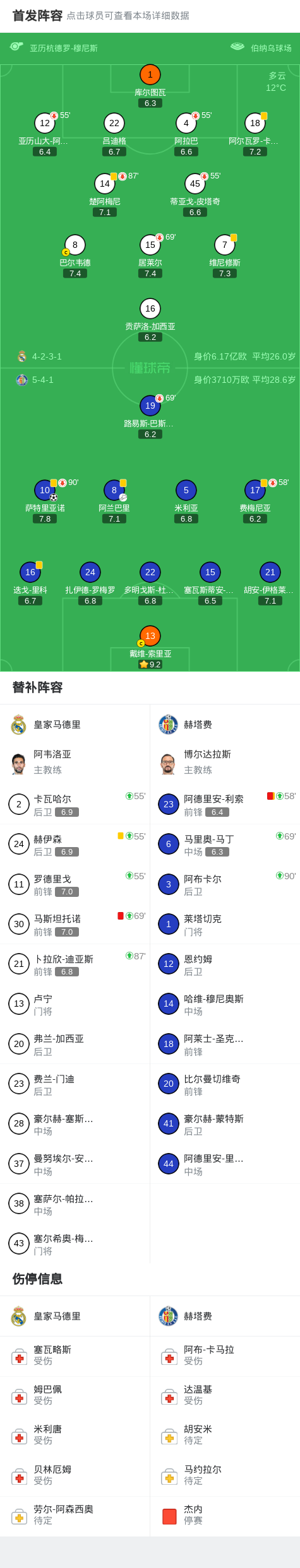 北京时间3月3日西班牙足球甲级联赛 联赛 第26轮,皇家马德里主场对阵赫塔费。上半场,维尼修斯单刀射门被门将挡出。随后,萨特里亚诺凌空抽射破门。下半场最后时刻,马斯坦托诺和利索相继被罚下。全场比赛结束,皇马0-1不敌赫塔费。关键事件第39分钟,反客为主,萨特里亚诺凌空抽射破门,皇马0-1第...